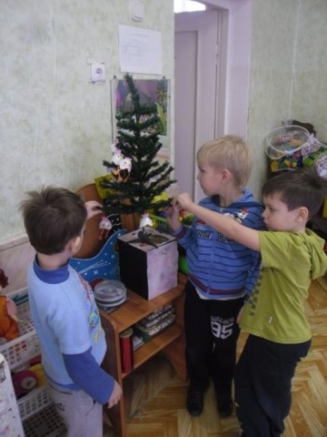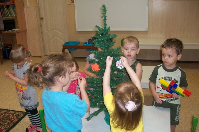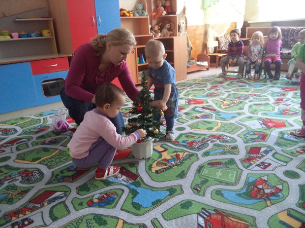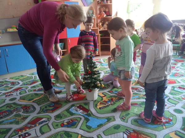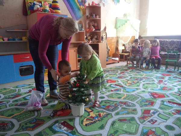 Малыши с огромным удовольствием украшали маленькую ёлочку настоящими ёлочными игрушками и водили хоровод вокруг неё. Во время игровых сеансовзнакомились с новогодними традициями и сами делали новогодние подарки для своих родителей.