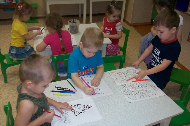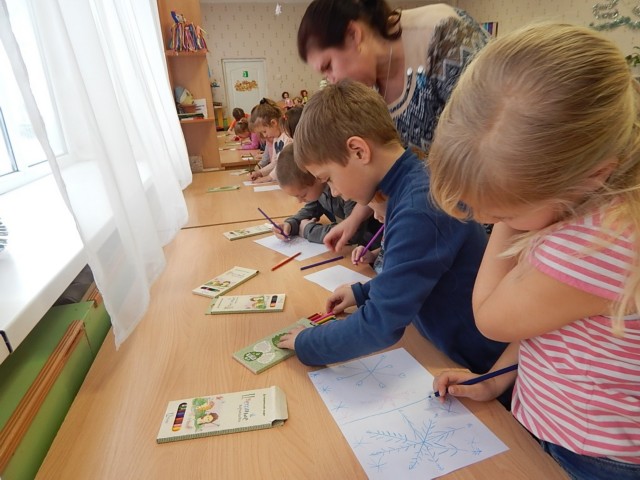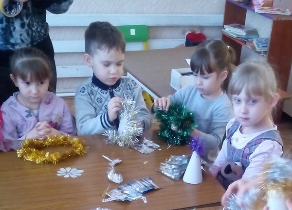 Ребята с увлечением занимались продуктивной деятельностью: рисовали карандашами, гуашью и пластилином морозные узоры, красивые снежинки, портреты Деда Мороза, новогоднюю ёлочку; конструировали из бумаги и картона ёлочные игрушки (гирлянды, фонарики, рожки мороженого), выполнили коллективную аппликацию «Веселый Новогодний хоровод», вырезали красивые снежинки и моделировали их, используя геоборд, геоконт, кубики Никитина, палочки Кюизенера, счётные палочки…