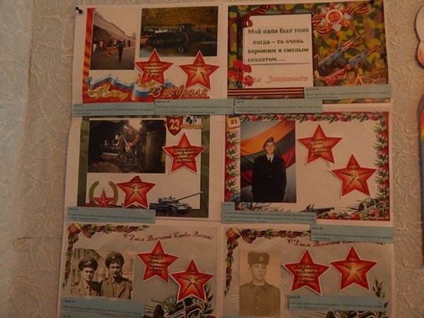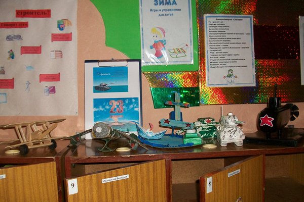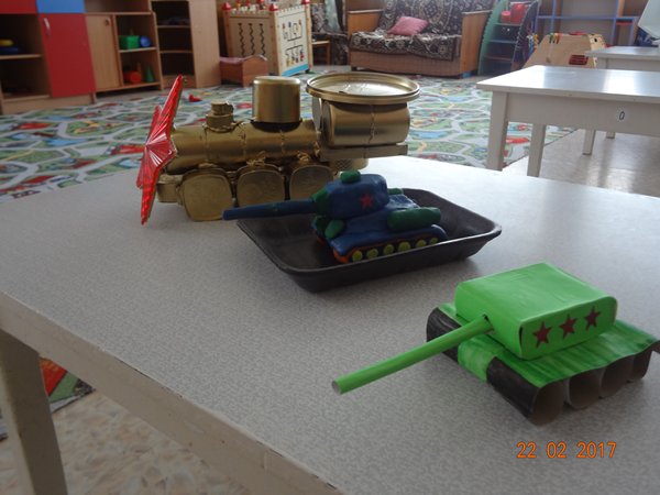 Во всех группах прошла выставка детско-родительских работ «Военная техника». Активное участие родителей и детей, творческий подход в изготовлении поделок сделал нашу выставку многообразной и интересной. Каждая группа выпустила газету «Мой папа был тоже когда-то очень хорошим и смелым солдатом».