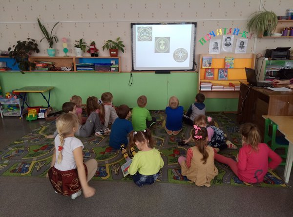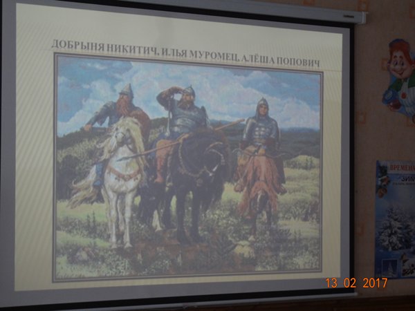 Дети младшей группы на «машине времени» отправились в путешествие и оказались в далеком прошлом, где встретились с могучими и храбрыми богатырями, стоявшими в те времена на защите нашей Родины. С помощью презентации и рассматривания иллюстраций ребята познакомились с оружием и обмундированием богатырей, пополнили свой словарный запас новыми словами (кольчуга, шлем, щит). Малыши попробовали себя в роли богатырей, разучив новый комплекс утренней гимнастики «Богатыри».