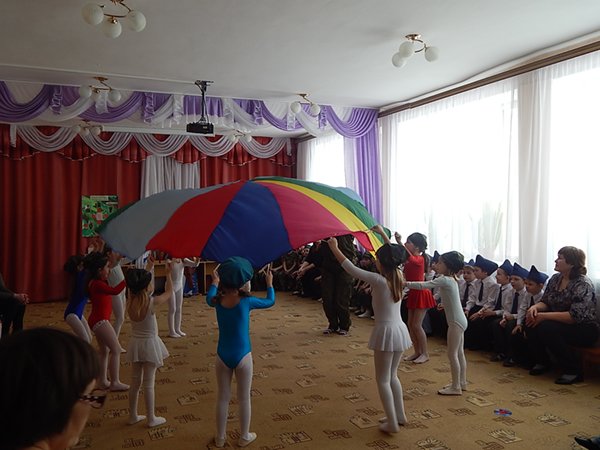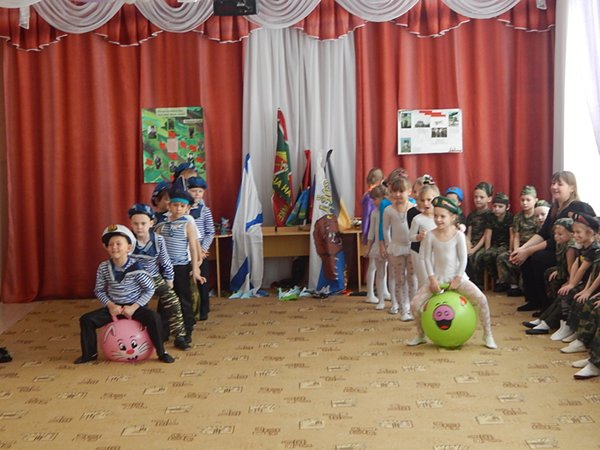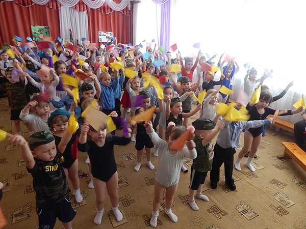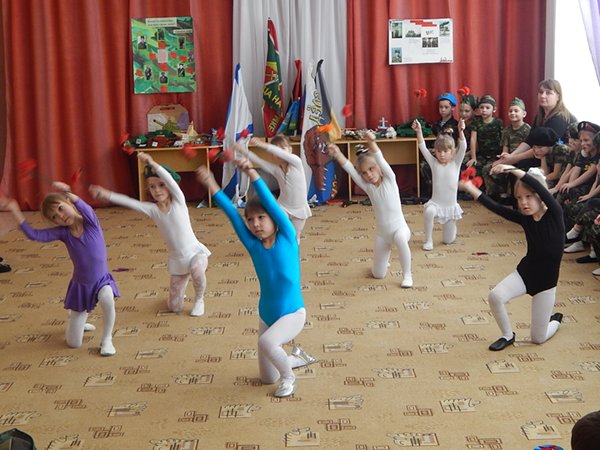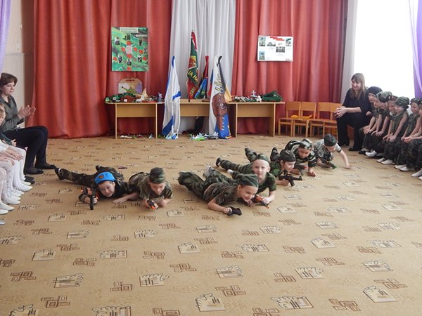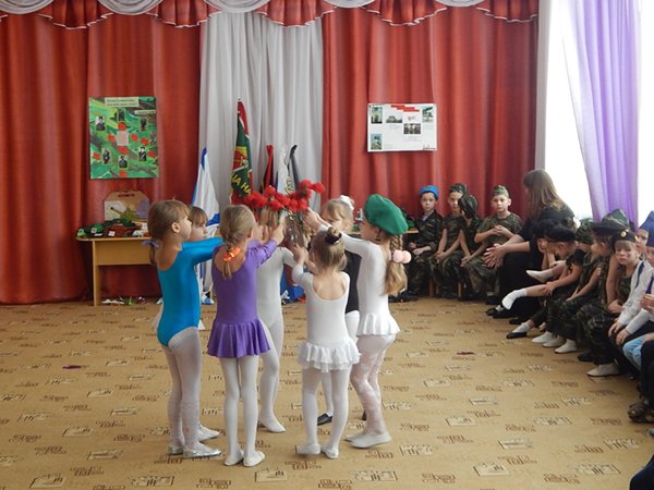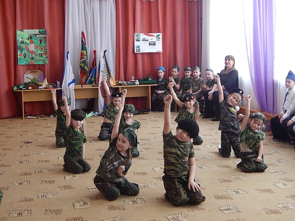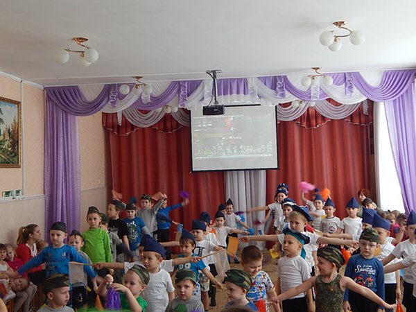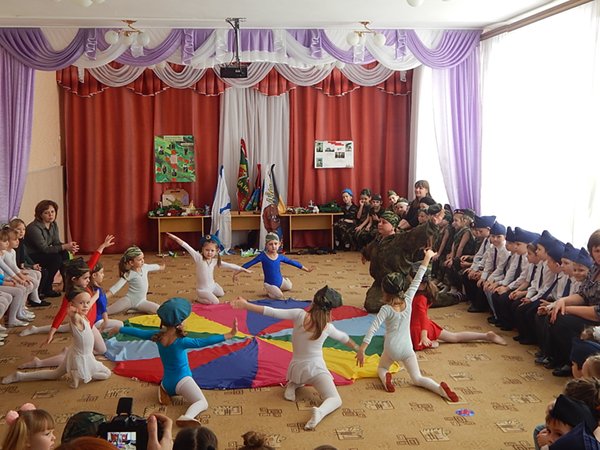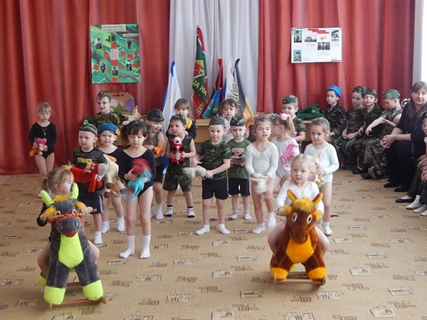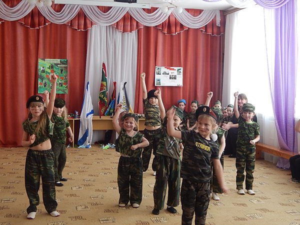 Завершал тему спортивный праздник «Военный парад». Главными героями были мальчики и девочки, которые не только показали боевую подготовку: «Пройти по минному полю», «Доставить боеприпасы», «Проскакать на коне», «Преодолеть полосу препятствий», но и выполнили гимнастический этюд «Синева», спортивный танец «Самолеты», гимнастическую композицию «Служить России суждено тебе и мне», аэробику «Защитники Отечества», музыкально-спортивный танец «Кавалерия», гимнастический танец «Пацаны в строю стоят», аэробику «Морпехи», гимнастический этюд «Офицеры границы», спортивный танец «Моряк». Папы достойно выступали в роли солдат, проявляли свою силу и смекалку. Праздник закончился традиционно флэшмобом «Наша Армия».