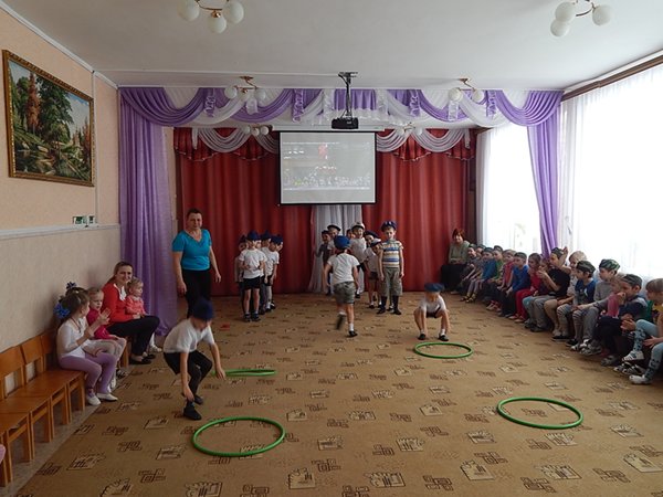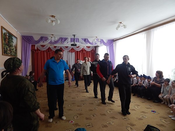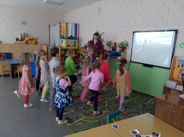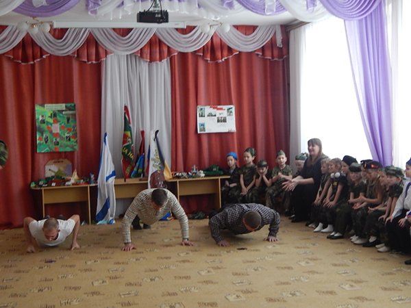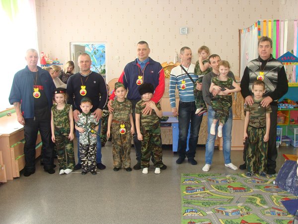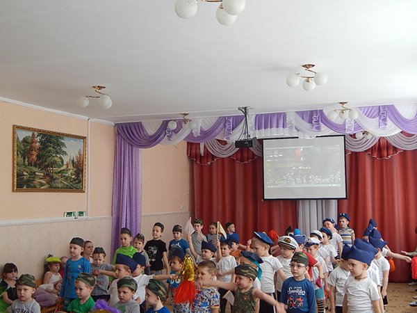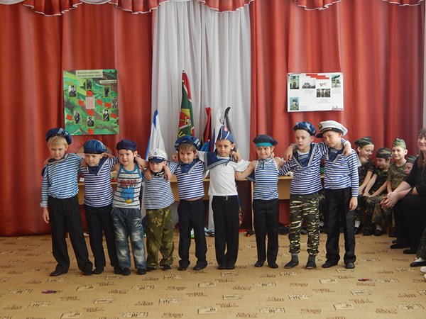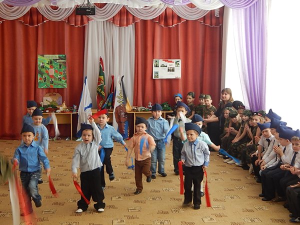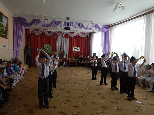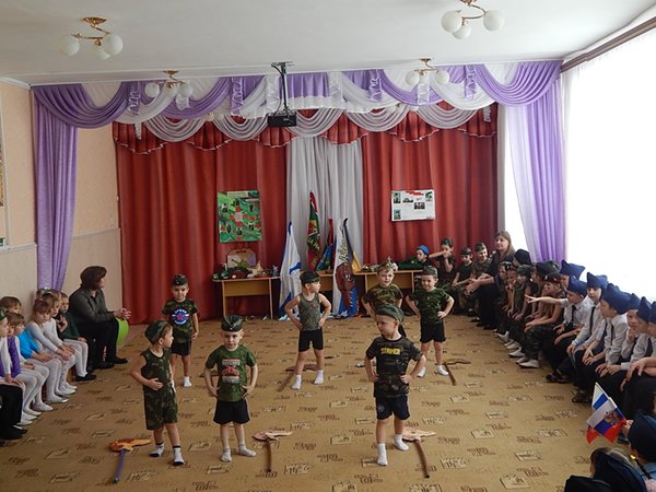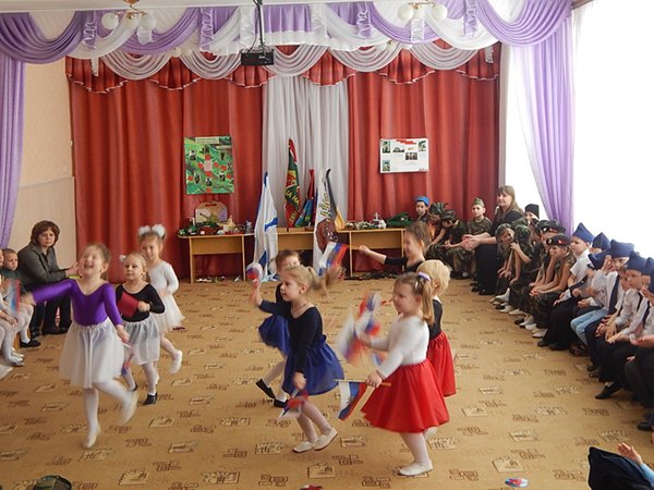 Завершал тему спортивный праздник «Военный парад». Главными героями были мальчики и девочки, которые не только показали боевую подготовку: «Пройти по минному полю», «Доставить боеприпасы», «Проскакать на коне», «Преодолеть полосу препятствий», но и выполнили гимнастический этюд «Синева», спортивный танец «Самолеты», гимнастическую композицию «Служить России суждено тебе и мне», аэробику «Защитники Отечества», музыкально-спортивный танец «Кавалерия», гимнастический танец «Пацаны в строю стоят», аэробику «Морпехи», гимнастический этюд «Офицеры границы», спортивный танец «Моряк». Папы достойно выступали в роли солдат, проявляли свою силу и смекалку. Праздник закончился традиционно флэшмобом «Наша Армия».