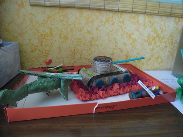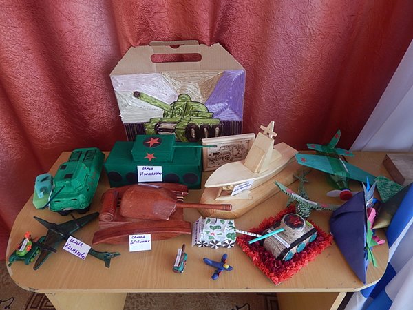 Родители с детьми сделали поделки, приуроченные к 23 февраля. Ребята поделились секретом, из чего сделаны поделки, и как создавались эти шедевры.