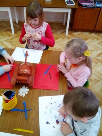 С большим интересом ребята изображали с помощью красок плывущий по волнам кораблик, лепили из пластилина танки, из природного материала(шишек) и конструктора, мастерили самолеты.