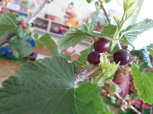 Когда появились ягодки, решили посадить смородину в емкости с грунтом. К концу апреля ягоды уже начали буреть. После первомайских праздников детей ждал сюрприз – несколько ягод смородины стали иссиня -черного цвета! Сейчас на дворе май, а мы с нетерпением ждём сбора первого урожая ягод.