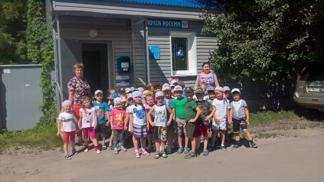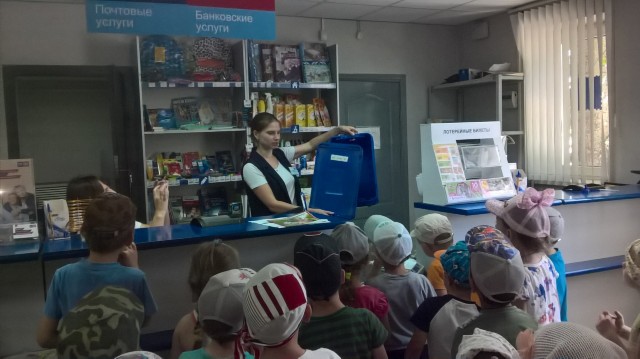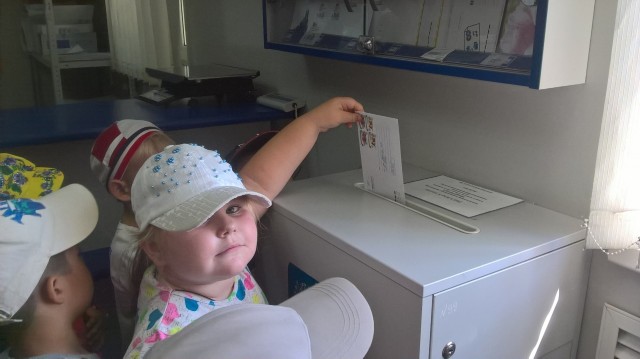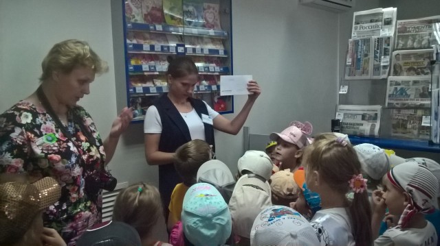 Нас встретила заведующая почтовым отделением, которая показала детям приёмное отделение связи. Рассказала и показала детям, как и куда поступает вся корреспонденция: посылки, газеты, журналы, письма. Дошкольники узнали о том, как правильно отправить письмо: написать адрес, приклеить марку. Работник почты предложил отправить письмо в свой детский сад. Сколько радости испытали дети, когда опустили письмо в почтовый ящик. Также ребятам объяснили, что в почтовом отделении можно отправить не только посылки и письма, но и оформить подписку на журналы, получать денежные переводы, оплачивать коммунальные услуги.