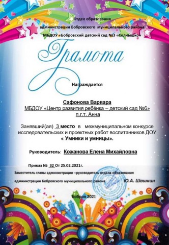 Воспитанники детского сада, под руководством педагогов, приняли активное участие в межмуниципальном конкурсе исследовательских и проектных работ воспитанников ДОУ "УМНИКИ И УМНИЦЫ" и стали призерами конкурса.